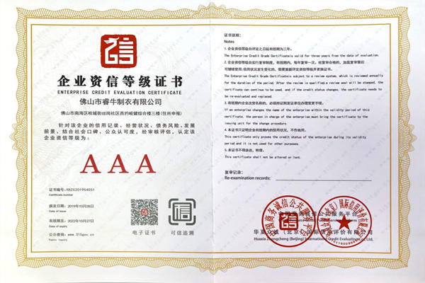 佛山市睿牛制衣有限公司——3A級(jí)企業(yè)資信等級(jí)證書;