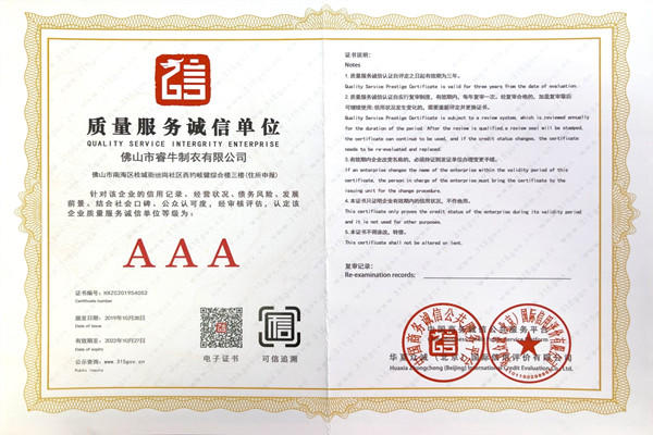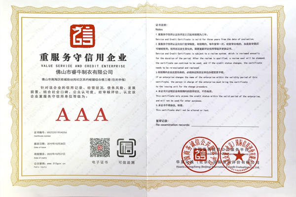 佛山市睿牛制衣有限公司——3A級(jí)重服務(wù)守信用企業(yè);