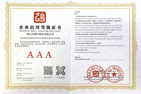 佛山市睿牛制衣有限公司——3A級(jí)企業(yè)信用等級(jí)證書;