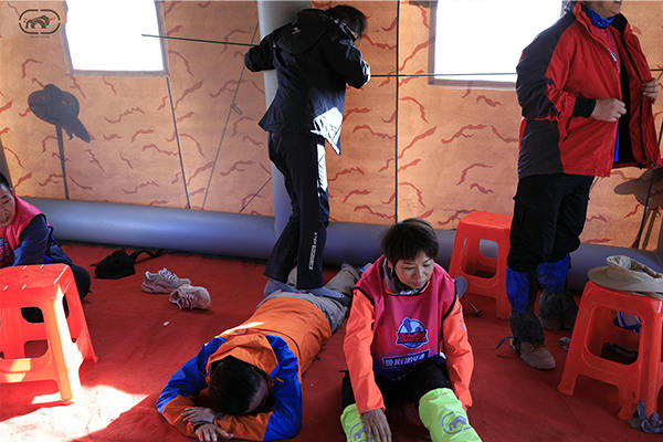 傍晚達(dá)到營地,每個人都風(fēng)塵仆仆,脫下襪子腳腫了一圈,有的襪子被血水模糊了,撕下來淚水隱忍而出。看著周邊的同伴,原以為她自己情況是最慘的,但不知團隊里有人原本就膝蓋痛,有的人發(fā)燒,有的人也來例假,有的人近240斤仍不懈前行,有的人比自己還要高齡也不放棄。