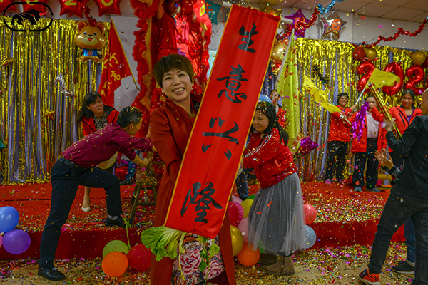 獅子在“獅子郎”的引導下,表演騰翻、撲跌、跳躍、登高、朝拜等技巧;最最主要的高潮采青,獅子獵取懸掛于高處的“利是”(以生菜為多),圖片中展示了獅子將獵取的“利是”扔向華姐的手中,以及“生意興隆”對聯(lián),愿2020年紅紅火火、生意興隆、事事平安;