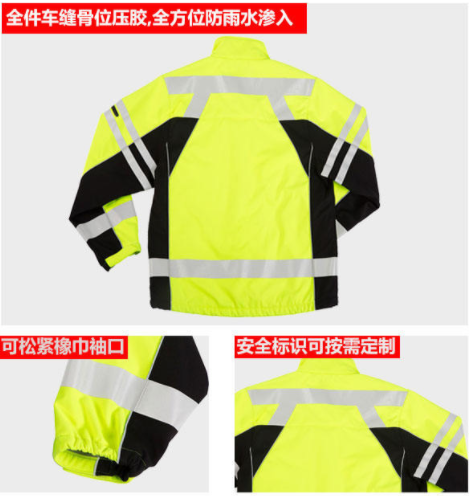 相對(duì)于老款的交警執(zhí)勤工作服,如今新款有很多優(yōu)點(diǎn):面料更防雨,白天熒光顏色更醒目,反光條面積的增加使夜間值班的保護(hù)效果更好。例如,我們【佛山思諾華服飾公司(睿牛制衣)】為某單位定制的沖鋒衣工作服的布料為三層復(fù)合布,是一種高性能防水防風(fēng)透濕功能性面料,面料有兩個(gè)關(guān)鍵指標(biāo):透濕量每24小時(shí)每平方米超過(guò)10000克,防水壓超過(guò)20000毫米水柱。