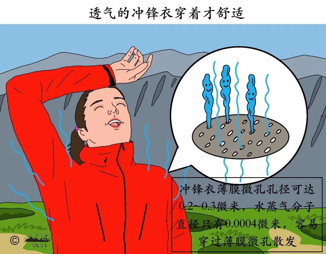 透氣性關(guān)乎舒適度——人體散發(fā)的汗液以水蒸氣形式通過沖鋒衣傳導(dǎo)到外界,從而避免汗液集聚冷凝在沖鋒衣內(nèi),是沖鋒衣舒適性的關(guān)鍵。