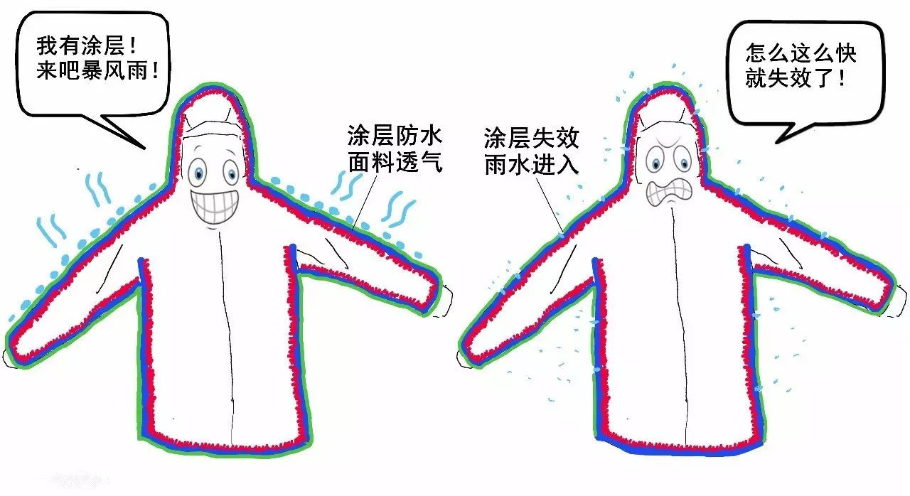涂層可以實現(xiàn)“荷葉效果”,讓水珠滾落,同時水蒸氣能從面料縫隙排出。