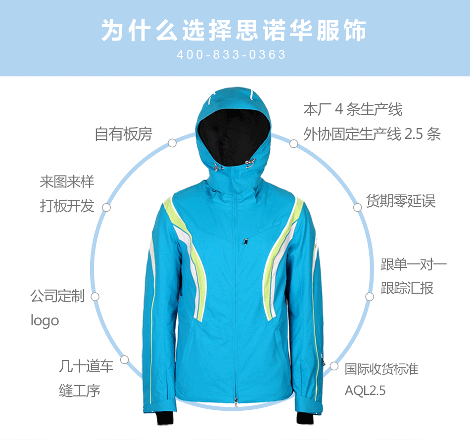 防水拉鏈采用無縫壓膠防水拉鏈激光熱封工藝貼合,面料采用進口防水透氣涂層膜,使防水透氣膜與面料完美結(jié)合。可根據(jù)客戶需求生產(chǎn)加工沖鋒衣。