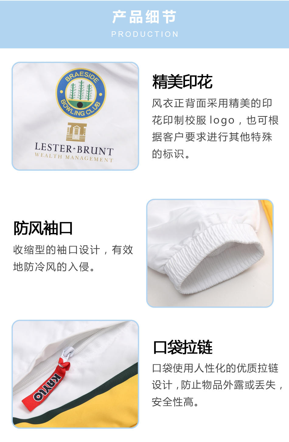 精美印花:風衣正背面采用精美的印花印制校服logo,也可根據(jù)客戶的需求進行校服風衣定制其特殊的標識。