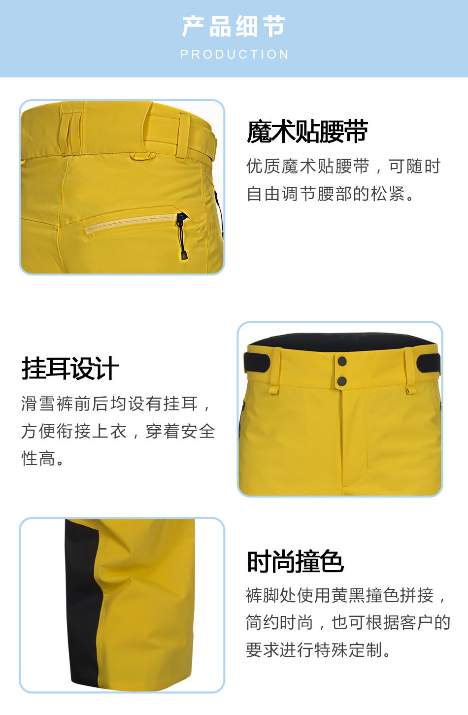 掛耳設(shè)計:滑雪褲定制前后均設(shè)有掛耳,方便銜接上衣,穿著安全性高。