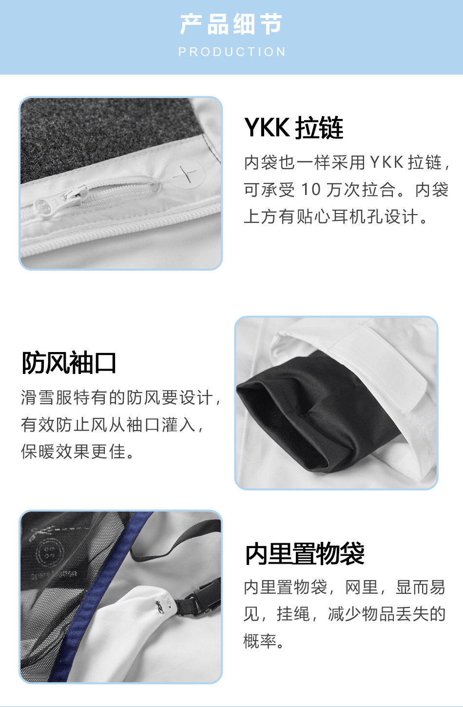 防風(fēng)袖口:滑雪服特有的防風(fēng)袖口設(shè)計,從袖口防止風(fēng)進入身體,量身進行滑雪服定制。